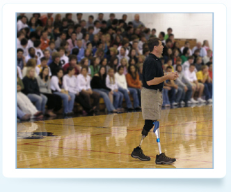 Dana will jump, quite literally into your school event, a breath-taking and inspirational sight, and the perfect way to begin an unforgettable keynote with Dana! He jumps into presentations over 100 times per year to “hook” the audience. All wide-eyed attendees will watch a double amputee land on a dime—every time!