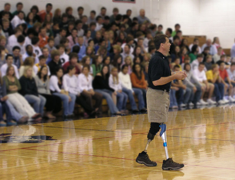 Dana emphasizes the essential role of teachers to: · Motivate resistant students · Recognize all students’ strengths and abilities · Vary teaching approaches to meet learner differences · Remove barriers to student success Dana was the first member of his family to earn a college degree and now better understands the importance of providing students with tools to become life-long learners. In addition, educators have the opportunity to increase their understanding of persons with disabilities to encourage support and acceptance of those with challenges. Sgt. Bowman’s message offers new ideas for the role of schools and community in supporting persons of varied abilities through the networking of resources to support their needs. Educators’ comments from staff development evaluations: · Dana is inspiring; I’ve heard him 3 times this week and each time I got more ideas to try to inspire my students. These were fantastic useful resources and ideas! · Excellent presentation! Excellent video! Excellent message! · Thank you – it’s not about us, it’s about the children and the future of America. Inspirational and motivating presentation. · Outstanding! I’m inspired to work harder and to help others more. Thank you for this special morning. · Your determination brings strength to others! Thanks! · I can hardly wait to show my kids all that they can do. · Very inspiring! It allows you to look at all aspects of learning and growing, and it gives you ideas on how to help. · Excellent presentation and presenter. What a powerful message! I’m glad that this message will be shared with so many students. I hope their teachers are listening! · The absolute best seminar I have been to for a long time. I so wish my own personal children could have been here beside me to hear this life story. I wish too that Dana could make a personal visit to my 1st grade. · Sgt. Bowman presented his experiences in an articulate manner. His ability to connect his experiences to the challenges that others experience made a powerful argument for focusing on students’ strengths when developing learning plans. Thanks so much! · Sgt. Bowman is a regular person who is striving to communicate the endless possibilities that are available to all of us. Great job! · Very inspiring and it was nice to see a local person making such a monumental difference. Excellent for motivation – getting teachers back in focus of our goals. · Dana Bowman is certainly a force to be reckoned with. His spirit extends forever. Thank you. FOR STUDENTS: Dana shares his very personal story as a struggling student who was resistant to rules and restrictions of school. He encourages students to value teachers and adults as role models. Dana is able to customize his presentations to students at every grade level. Students of all ages are inspired by his achievements, challenges and strong will to overcome adversity. Dana’s presentation includes a video accompanied by his live narration of his life in the military, the accident and his recovery. Students are captivated and literally “on the edge of their seats” in every presentation. Assemblies may also include time for questions as well as a time for Dana to autograph his special posters. "My message is for everyone young, old, able, disabled," he said. "I just want people to see how limitless their lives are. Look at me, I lost everything, and here I am. If I can do it, anyone can." Dana believes his message helps students to: